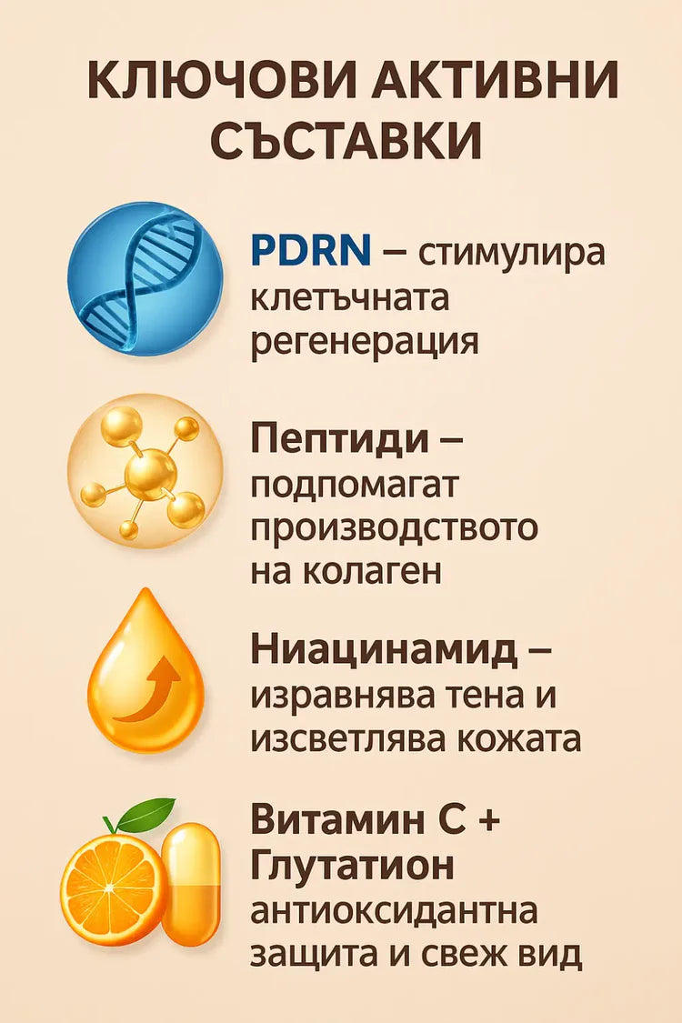 NAD+ зарежда клетките с енергия, а пептидите засилват производството на колаген. Комбинацията осигурява хидратация, стегнатост и гладка кожа с естествено излъчване – без сложна рутина.