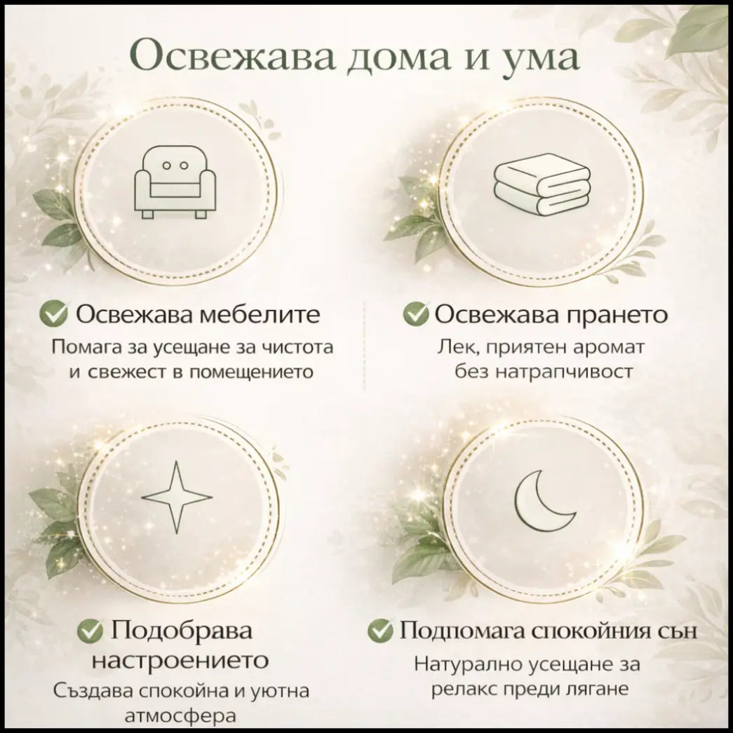 Нежен ароматерапевтичен спрей, който комбинира етерични масла и подбрани растителни екстракти. Предназначен е да създава уютна и релаксираща атмосфера — само с няколко впръсквания - Без синтетични аромати, без химикали и натрапчиви миризми.