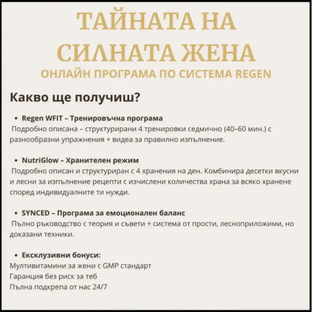 Ако си тренираща жена над 35 години, която иска устойчиво младежко излъчване с красива женствена фигура, то с тайната, заключена в системата Regen ще получиш точно това.